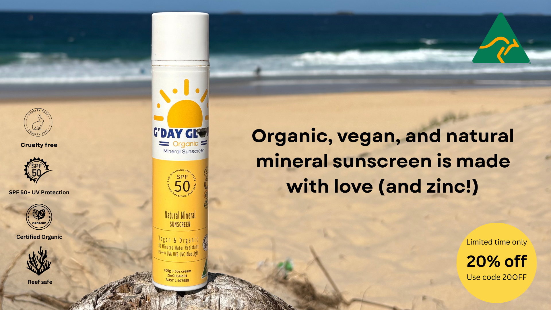 At Gâday Glow, weâre all about sun care thatâs as kind to your skin as it is to the planet. Our organic, vegan, and natural mineral sunscreen is made with love (and zinc!) to give you serious protection without the nasties. No chemicals, no white cast, no worries â just clean, skin-loving ingredients that keep you glowing from sun-up to sundown.