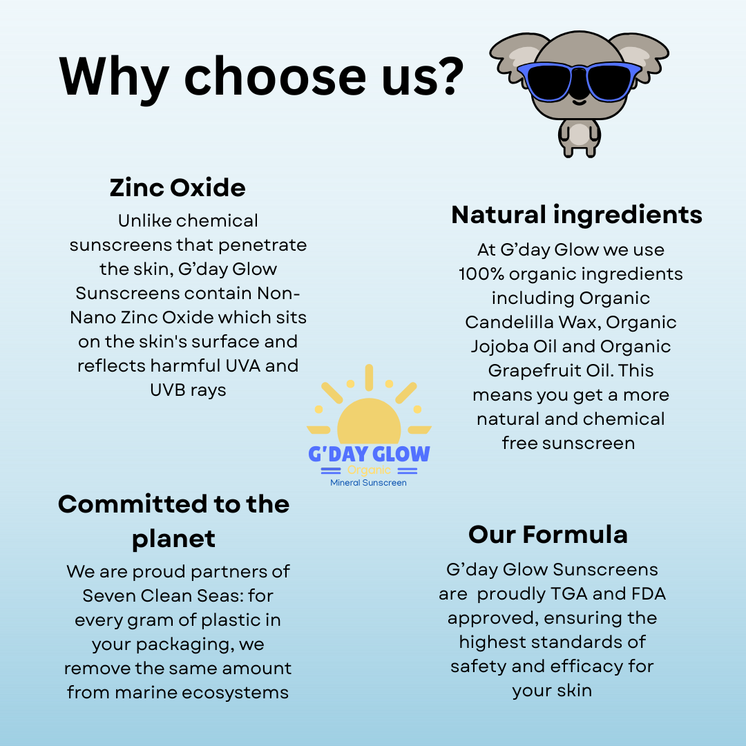 Born under the Aussie sun, G’day Glow is all about feel-good sun care that’s kind to your skin and the planet. We make organic, vegan, and natural mineral sunscreen that’s lightweight, reef-safe, and made for everyday glow-getters. No nasties, no white cast — just sunny skin, the way nature intended. ☀️🌿